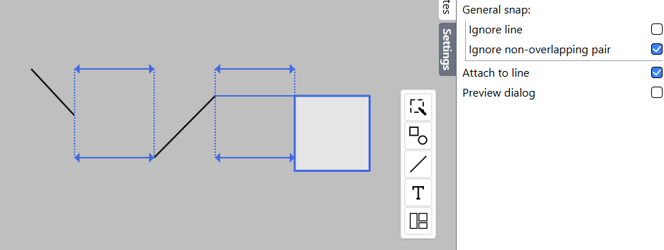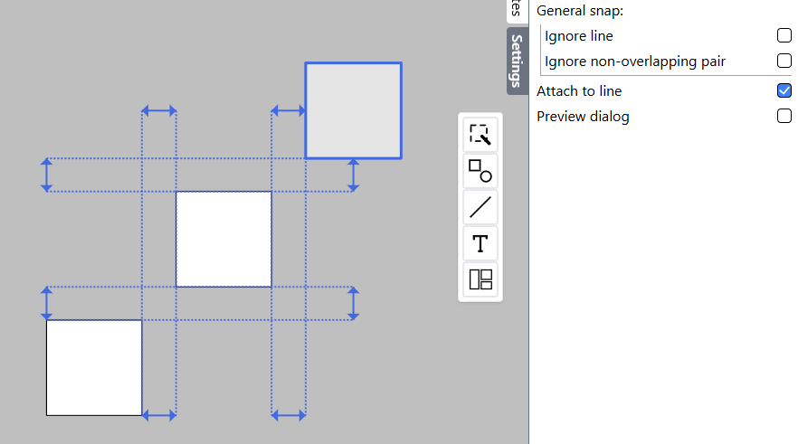Snapping guidelines are generated based on the bounding box of each shape within the viewport.